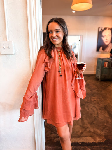 Discover the beauty of the Sofina Dress! In a stunning salmon color, this dress features a ruffled design, long sleeves, and a high neck. The mesh ...