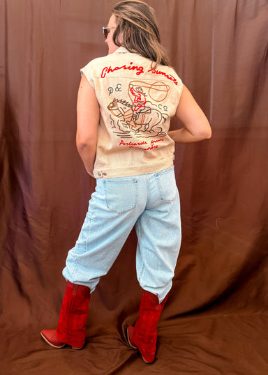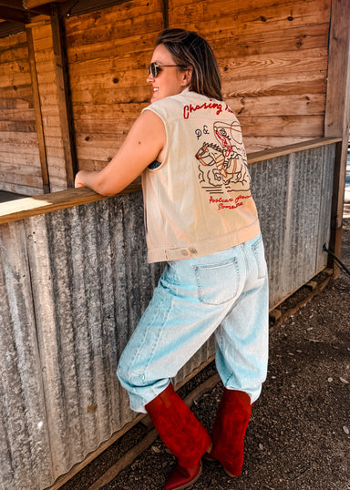 Saddle up in style with this sleeveless denim vest featuring bold cowboy embroidery and nostalgic Western flair. Designed for layering, it adds a r...