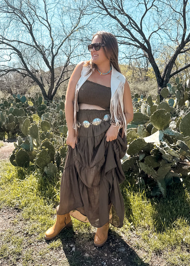 A rich toffee dress for those who dare to stand out! Accented with statement fringe, this sleek, form-fitting halter dress is pure style. For a dar...