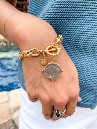 From the brand Susan Shaw, we present our Gold and Silver Vintage Buffalo Head Coin Bracelet. Inspired by Northern European styling, it boasts a bu...