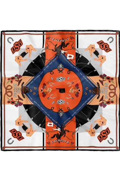 100% silk double digital print with self frayed edges (aka fringed) 26in x 26in Features spirited illustrations and phrases around a center star de...
