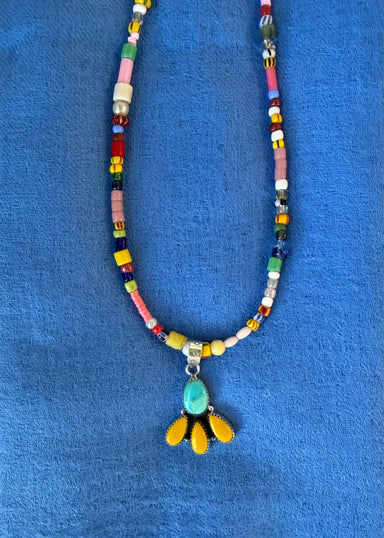 Sterling silver with turquoise and yellow rosarita on 21" strand of hand strung mixed African beads.