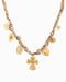 This standout necklace features a knotted paisley scarf chain adorned with gold-toned charms—including a crystal cross, hearts, and vintage-inspired emblems.