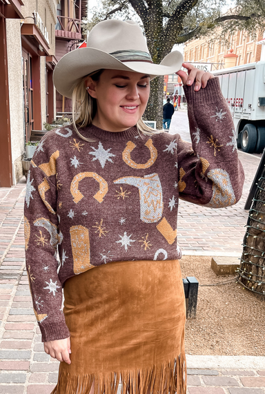 Saddle up in style with our See You Cowboy Sweater! This chocolate-colored pullover is accented with turquoise detailing and features a playful twi...