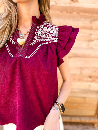 Twirl into your next girls' day in this charming burgundy flutter sleeve top! The delicate flutter sleeves add a touch of whimsy and feminine flair...