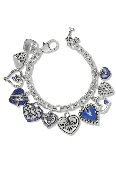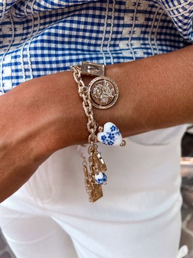 This charm-loaded chain bracelet features a stunning ceramic-style porcelain heart, paired with intricate vintage-inspired charms — from a pearl-do...