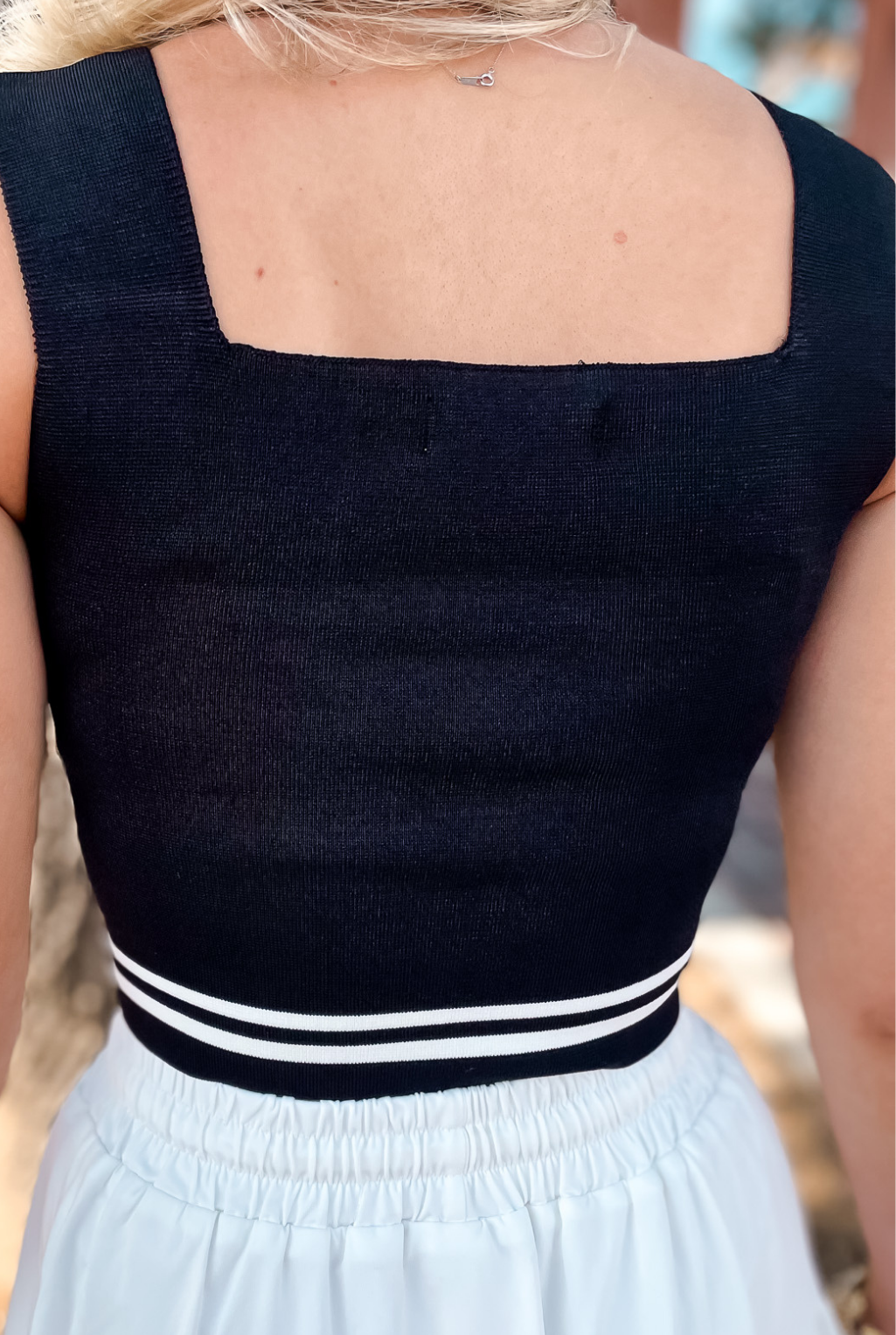 Score a style touchdown with our Striped Square Neck Brami Top in classic black! This cute and comfy top is not only flattering, but also perfect for game day or running errands. For a winning look, pair with our tennis skirts and cute sneakers.