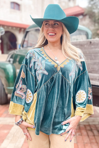 Our cape brings bold sophistication to your lineup. Constructed from premium faux suede, this cape stuns with black embroidered western motifs on b...