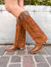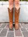 Sophisticated uptown style meets unbridled Western spirit on this knee-high boot designed with a pant-leg shaft ornamented with flame-shaped topstitching.