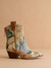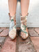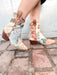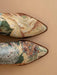 Introducing The Kaiya: a fresh take on Western boots with a vintage floral tapestry design. This boot features distinctive stitching, pull tabs, and a sharp pointed toe, all crafted from sustainable materials. Each pair displays a one-of-a-kind pattern, so no two boots are exactly alike. Note on fit: the tapestry fabric has no stretch, offering a wider fit—narrow to average feet should consider ordering a half size smaller for the best fit. Elevate your style with this unique blend of tradition and modern flair.
