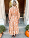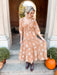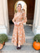 This long midi dress exudes rustic charm with its milkmaid-inspired top and puff sleeves that extend past the elbows, creating a romantic cottage feel. The top, with two buttons, is accentuated by an elastic waistband that defines the waist and flows into the skirt, which is subtly divided by trimming in three sections. The cream-colored fabric is beautifully embroidered with delicate flowers, enhancing the dress's natural, feminine vibe. Pair it with sandals while the sun still lingers, then switch to boots and a cardigan as autumn deepens. Whether you're headed to a weekend market or a cozy dinner, this dress blends comfort with timeless charm.