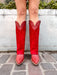 Sophisticated uptown style meets unbridled Western spirit on this knee-high boot designed with a pant-leg shaft ornamented with flame-shaped topstitching.