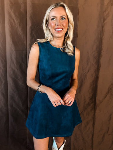 Twirl into the season in this charming navy flare dress! The sleeveless suede silhouette brings effortless elegance to any occasion, while the rich...