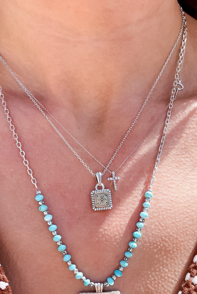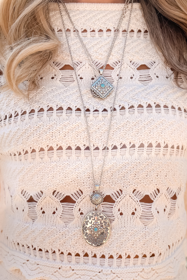 This layered necklace blends classic Western flair with modern detail. Featuring a denim-style knotted bandana strand adorned with charms paired wi...