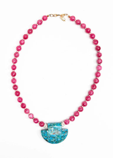 Turquoise drop shaped pendant mixed with fuchsia glass beads and African cream spacers. 17.5” long.