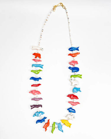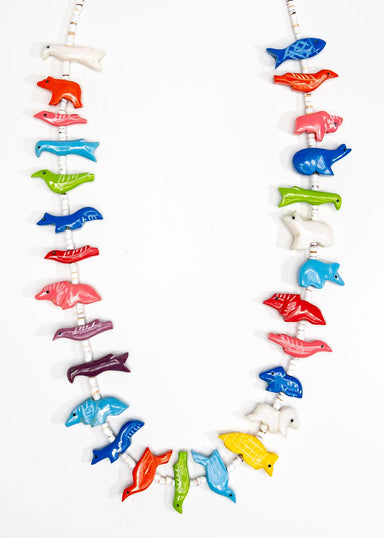 Mixed fetish animals with white heishi beads. Measures approximately 26" long.