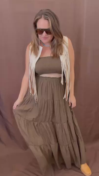 This chic set features a smocked tube top and a flowing tiered skirt, offering a blend of comfort and style. The top has a stretchable fit, and the skirt presents a relaxed silhouette, perfect for layering. Pair with a statement necklace and sandals for a breezy day look.