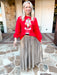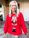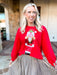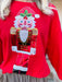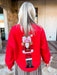 Celebrate the season in cozy style with this red oversized sweatshirt featuring a playful Santa Nutcracker design. Decorated with shimmering metallic accents and sparkling sequins on both front and back, it adds festive fun from every angle. Perfect for staying warm while spreading holiday cheer with a touch of sparkle!