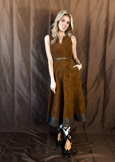 Supple faux suede enhances the swirl of the skirt for a belted dress closed with a tassel-tipped exposed zipper at the back. 47" length Exposed ...