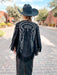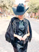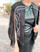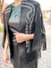 Our cape brings bold sophistication to your lineup. Constructed from premium faux suede, this cape stuns with black embroidered western motifs on both the front and back panels. The open poncho design allows for easy layering, while the long fringe hem adds movement and western drama. Style it over jeans or a skirt for a look that speaks to both heritage and high fashion. An essential piece for retailers looking to stock trend-forward western apparel with timeless cowgirl flair.