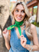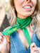 Beautiful Green Ascot Scarf with Yellow Embroidered Text. Add a bold pop of color and timeless charm with this green ascot scarf, featuring elegant yellow embroidered text for that extra touch of detail.
