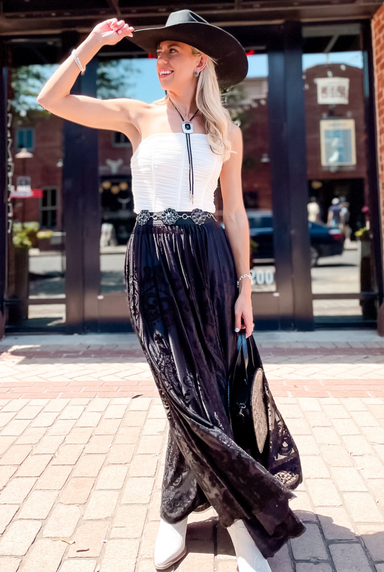 Step into rodeo season with the Western Scrolls Suede Skirt, a playful twist on classic western style. Its soft suede texture and intricate scroll ...