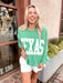 Show off your love for Texas with this ribbed oversized top. Perfect for any casual occasion, it's both comfy and cute. Pair it with leggings or jeans for a versatile look. Y'all are going to love it (and its Texas pride)!
