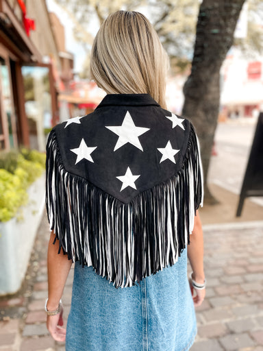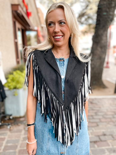 Spice up your wardrobe with our Fringe Collar. This fringe vest adds a touch of western flair to any outfit, making it a fun statement layer piece....