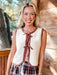 Slip into effortless style with this charming tie-front vest that's equal parts cozy and cool. The soft ribbed knit hugs you in all the right ways, while the relaxed boxy silhouette gives you room to layer like a pro. Bold contrast binding frames the edges for that coveted vintage vibe, and the double self-tie ribbons let you cinch it just how you like it. Sleeveless and lightweight, it's your new favorite piece for layering over everything from sundresses to sweaters. Perfect for those in-between seasons when you need warmth without the bulk.