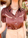 Elevate your style with the Smile Pocket Satin Top in rich brown. Featuring sleek satin fabric and authentic western stitch detailing, this piece effortlessly blends western chic with modern flair. Perfect for transitioning from workdays to weekend outings, it adds a playful touch while keeping you comfortable and stylish all day long.