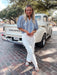 Styled with the Denim Bow Jean, Sun + Blue Charm Necklace, Porcelain Blue Charm Bracelet, and Lasso Sandal.