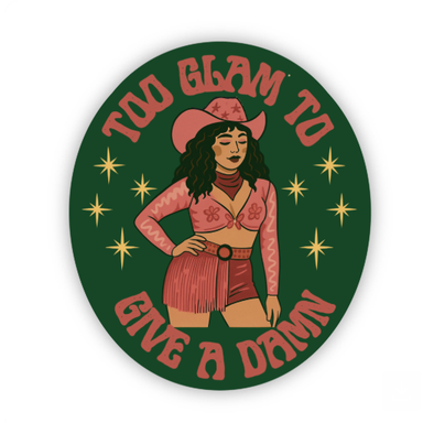 Shine bright and stay unbothered with our “Too Glam to Give a Damn” vinyl sticker! Featuring a fabulous illustrated cowgirl in fringe, florals, and...