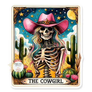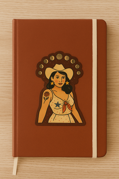 This dreamy vinyl sticker features a radiant cowgirl framed by the full cycle of moon phases. With star earrings, a rose tattoo, and a vintage polk...
