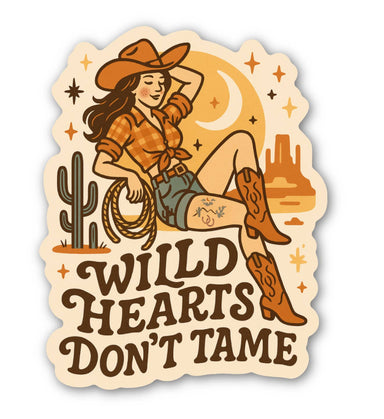 Celebrate your wild side with our Wild Hearts Don’t Tame cowgirl sticker—a dreamy nod to desert nights, untamed spirits, and Western grit. This ill...