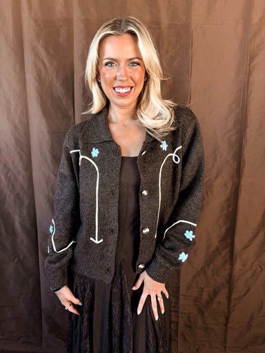 Wrap yourself in the charm of our Blue Blossoms Cardigan—a delightfully cozy layer that brings playful style to any outfit. Featuring a cheerful fl...