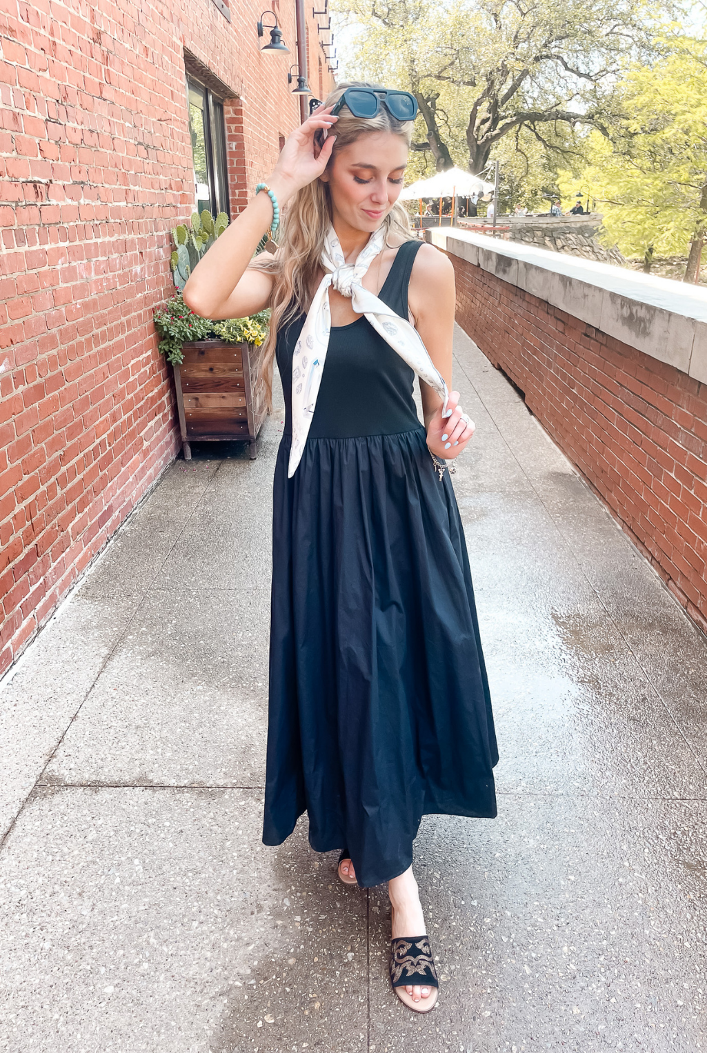 Styled with the Butterfly Claw Clip, Diamonds By Day Silk Square Scarf, Gold and Silver Genuine Buffalo Nickel on Turquoise Bracelet, Revival Sunglasses, and Lasso Sandal.