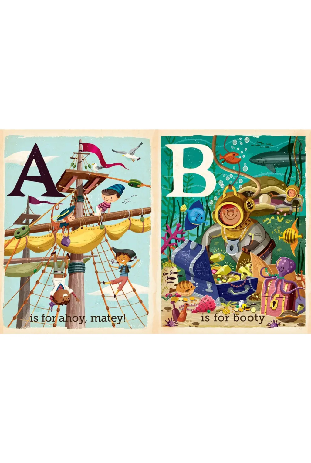 An engaging collection of illustrations teaching children all about the silly and fun world of pirates. Have fun reading with your child from A to Z as you come across letters such as these: A for Ahoy, matey!; D for Daring; O for Overboard; and S for “Shiver me timbers!” Each illustrated page contains a special hidden character that kids will find running throughout the whole book.