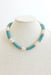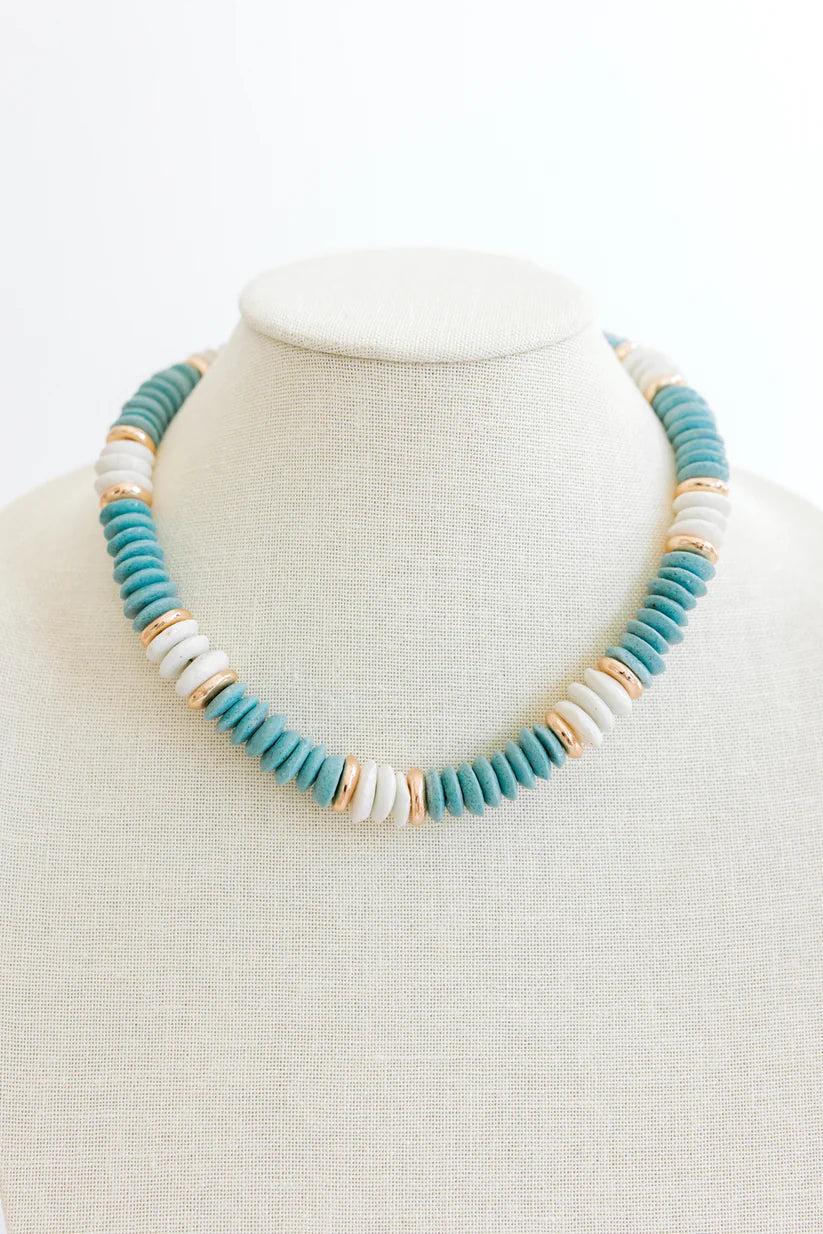 Introducing our playfully stylish Striped necklace. Made from recycled glass clay and accented with gold plated copper spacers. Dreamy blue and cream create a whimsical statement piece or complement to your Game Day outfit.